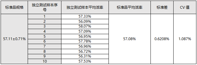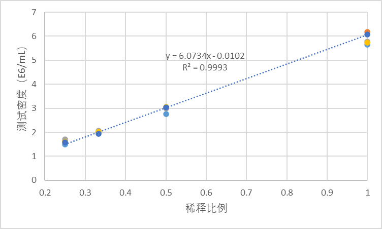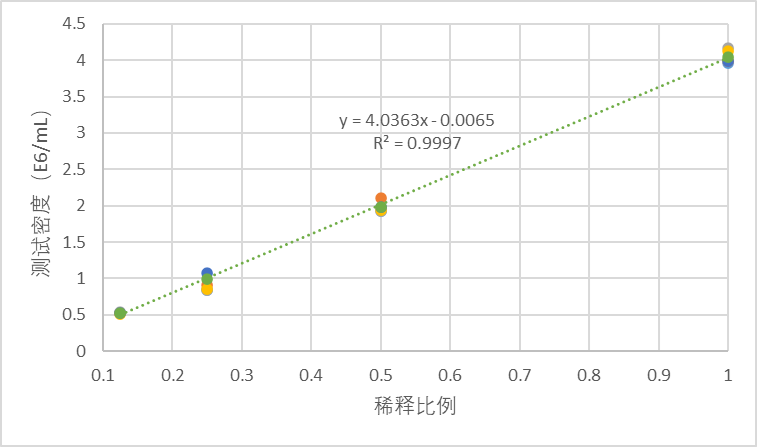 标准品测试:本测试内容包括密度标准品、活率标准品和粒径标准品,在标准品的密度(表1)、直径(表2)、活率(表3)测试中的CV值均小于5%,说明该款设备具有较好的精确度和重复性,且在厂家规定要求内;在标准品密度测试中的决定系数R²为0.9997(图1),表明不同稀释比例与测试密度的线性回归模型拟合度很高。