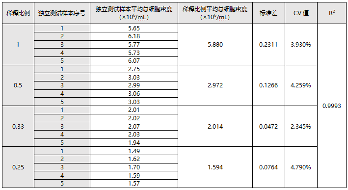 细胞测试:本部分测试了1株MSC细胞的总细胞密度,在细胞样品的密度测试中的CV值均小于5%(表4),说明该款设备对于细胞计数也具有较好的精确度和重复性,且在厂家规定要求内;决定系数R²为0.9993(图2),表明不同稀释比例与测试密度的线性回归模型拟合度很高。